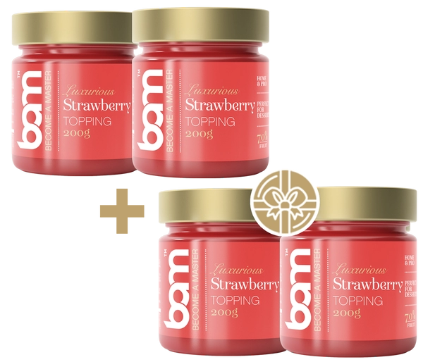 BAM Aardbeientopping is (200 g) een vruchtenpuree gemaakt van minimaal 70% aardbeien. De heerlijke en verfrissende smaak van aardbeien is perfect voor een zomerse limonade of een eenvoudige aardbeienmilkshake. Met de uitgesproken aardbeiensmaak kun je de smaak van gewone yoghurt, ijs of versgebakken pannenkoeken verrijken. BAM Aardbeientopping is ook perfect als vulling in chocoladetaarten of als topping op je volgende cheesecake met zijn levendige rode kleur. Voeg het toe aan een smoothie of havermout, maak chocolade muffins en vergeet geen lepel toe te voegen aan je volgende panna cotta.