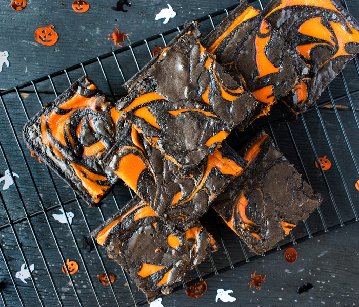 Zodra de brownies zijn afgekoeld, kun je ze in vierkantjes of andere vormen snijden. Geniet van je heerlijke Halloween brownies met oranje chocolade!