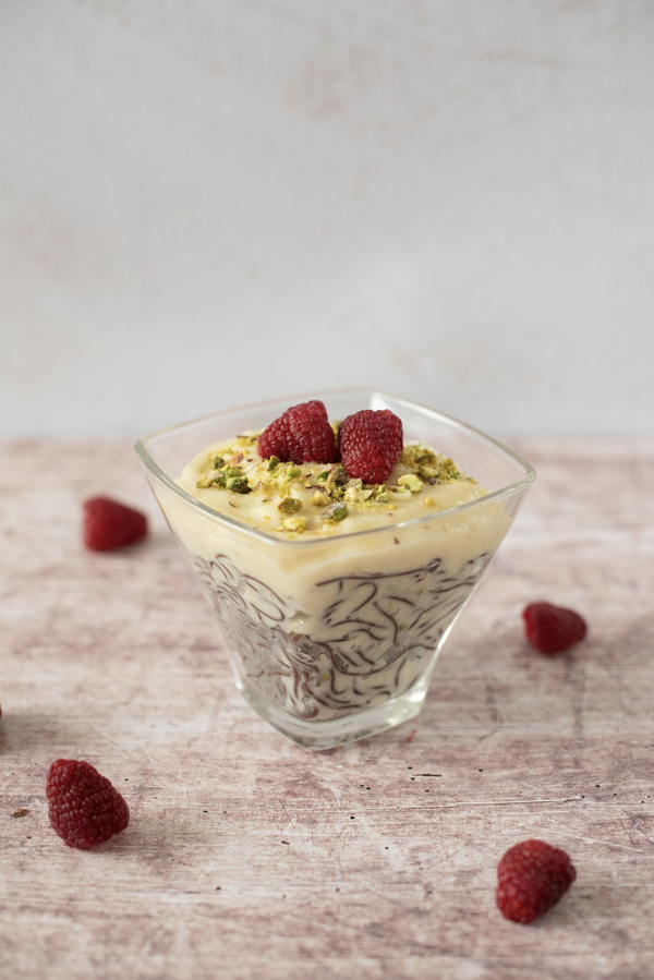 Chocoladepasta met witte chocoladesaus is een geweldige keuze als winterdessert. De delicate en licht bittere cacaosmaak gaat perfect samen met de zoetheid van de romige witte chocoladesaus en zal elke echte en nieuwsgierige zoetekauw bekoren.
