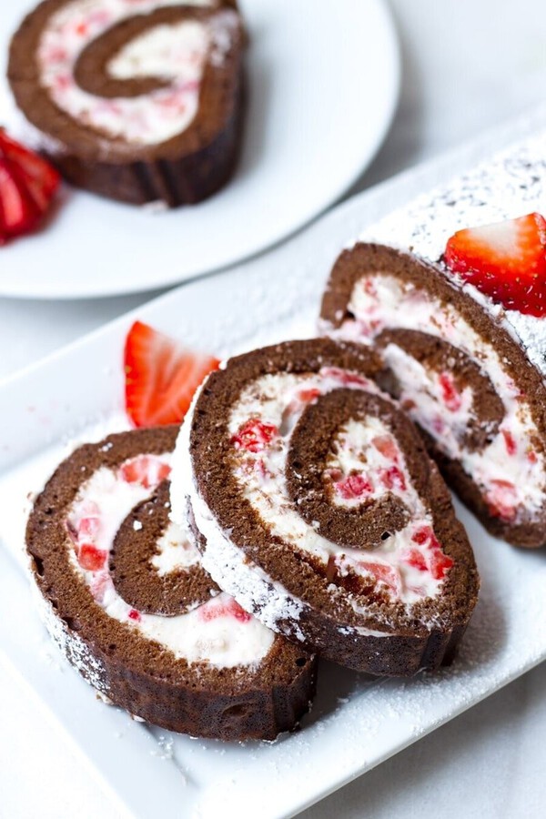 Rol het gekoelde rouladedeeg uit en verdeel de vulling erover. Bestrooi het met wilde bessen of ander fruit, bereid zoals je wilt.