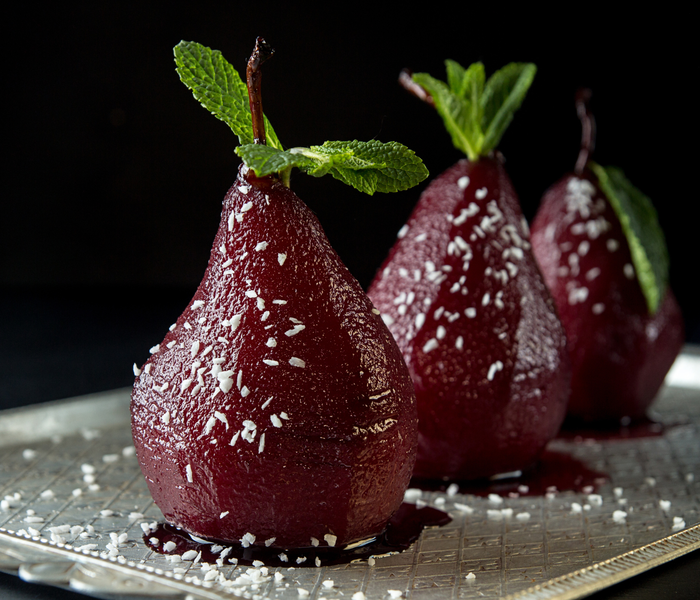 Eindbereiding: zeef de wijn in een pan door een vergiet om de kruiden en de schil van de citroen te verwijderen. Laat het mengsel sudderen tot het inkrimpt en er een dikke siroop ontstaat. Giet de saus over de peren. Laat lichtjes afkoelen en serveer met