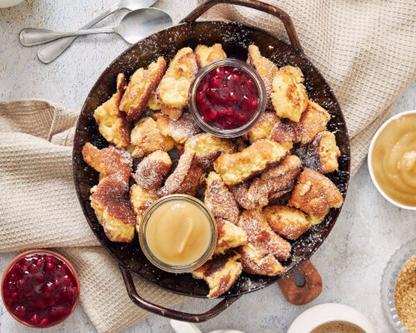 Tsarengebraad of schmorn is een snel en gemakkelijk gerecht dat kan worden geserveerd als ontbijt of diner, maar ook als lunch. Het past perfect bij BAM-spreads, frambozentopping of gewoon een lepel poedersuiker. Het is een bladerdeeg dessert, en rozijnen zijn ook toegevoegd aan het recept als een origineel. Het staat ook bekend als "keizerlijke puinhoop" en kan ook een luchtige en lichte reuzenpannenkoek worden genoemd, die na het bakken in kleine stukjes wordt gescheurd. Het kan op twee manieren bereid worden: in een koekenpan of gebakken in de oven. We hebben een recept gemaakt voor in de oven gebakken schmorn, waardoor hij nog luchtiger wordt en geen extra bereidingstijd kost.