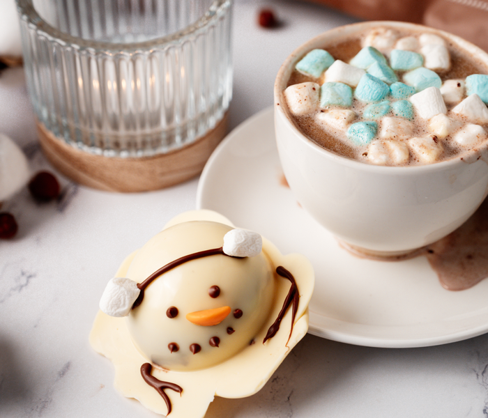 BAM Witte Chocolade geeft de sneeuwpop een glanzende look; BAM Mini-Witte Suikermousse voegt een speels karakter toe; BAM Warme Chocolade met Hazelnoten is het hoofdingrediënt van het dessert en, last but not least, BAM Melkchocolade accentueert de details.