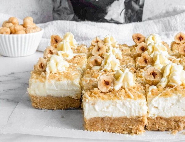Giet over de koekjesbodem en zet minstens 2-3 uur in de koelkast. Bestrooi de bovenkant indien gewenst met extra gemalen hazelnoten en gesmolten chocolade.